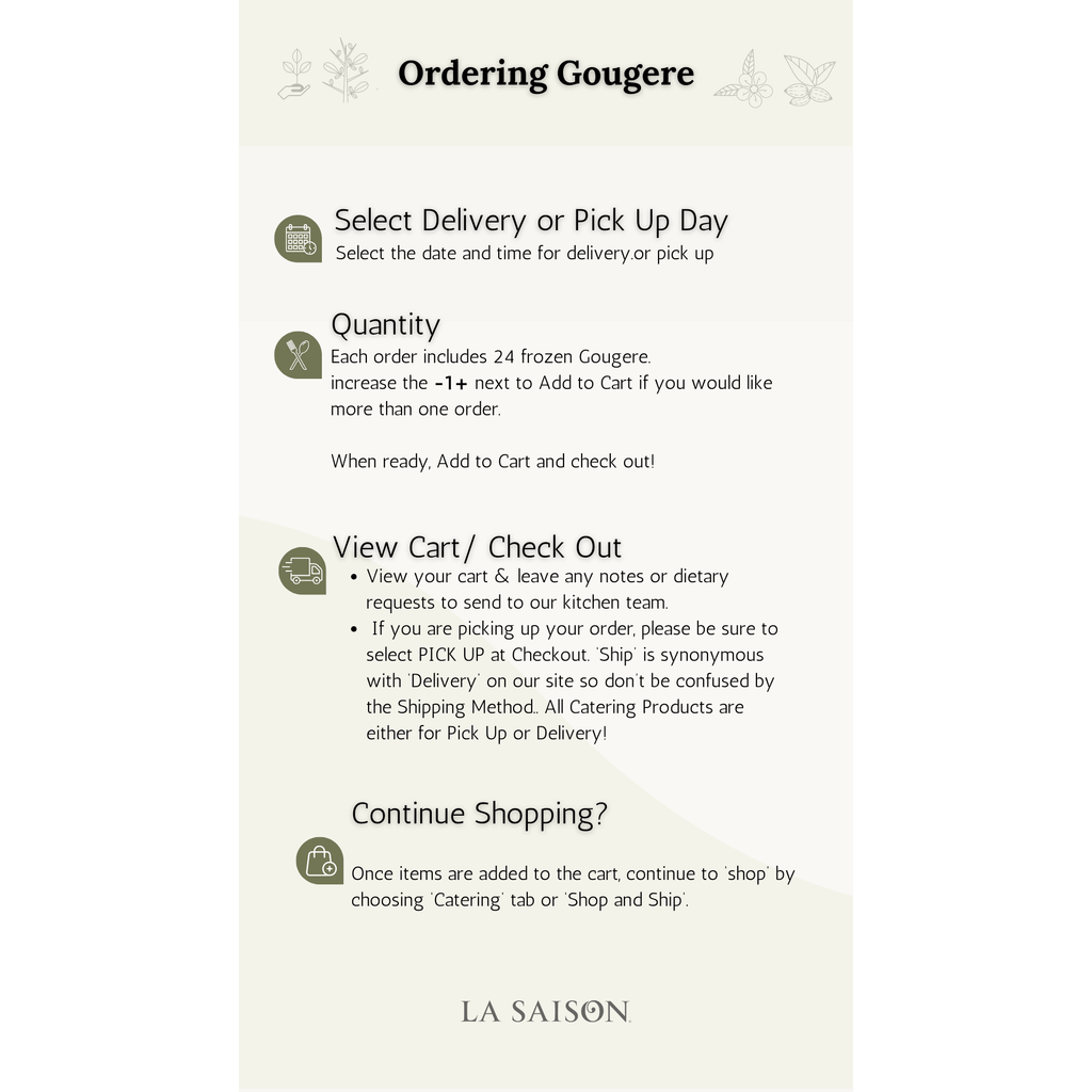 Baking Instructions: Preheat oven to 325-350 degrees depending on if your oven runs hot. Place the Gougère on parchment paper on a sheet pan (aka cookie pan), and space apart as you would cookie dough. Bake for 15-18 minutes without opening the oven. The aroma will be extraordinary and you will want to check on your little cheese puffs but let them bake! The Gougère will be ready when like Goldilocks, they are not too light, not too dark, just lightly golden brown. Enjoy warm!