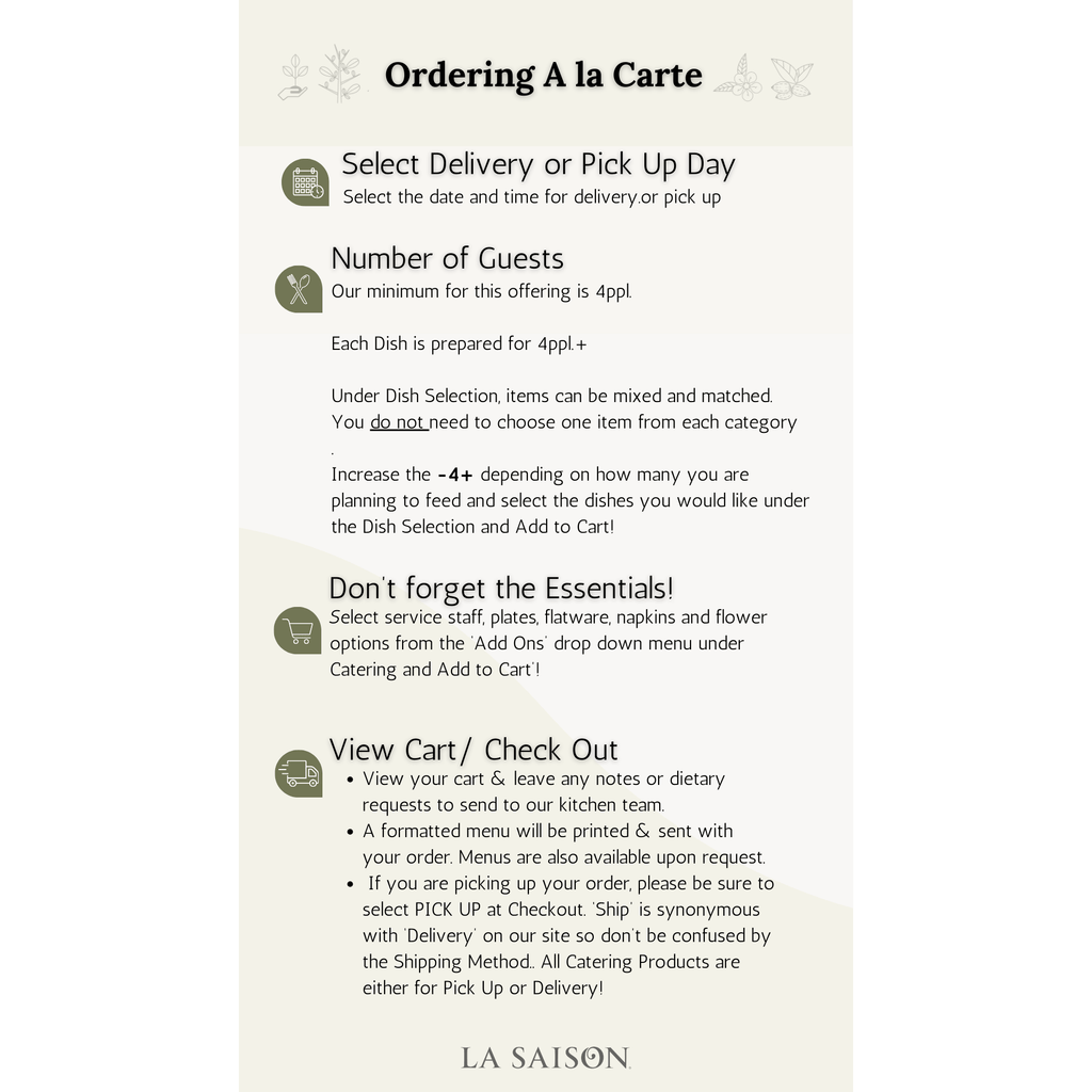 Check your cart to add any dietary notes for our kitchen team. We are happy to accommodate Vegan, Vegetarian and/or Gluten Free Requests.