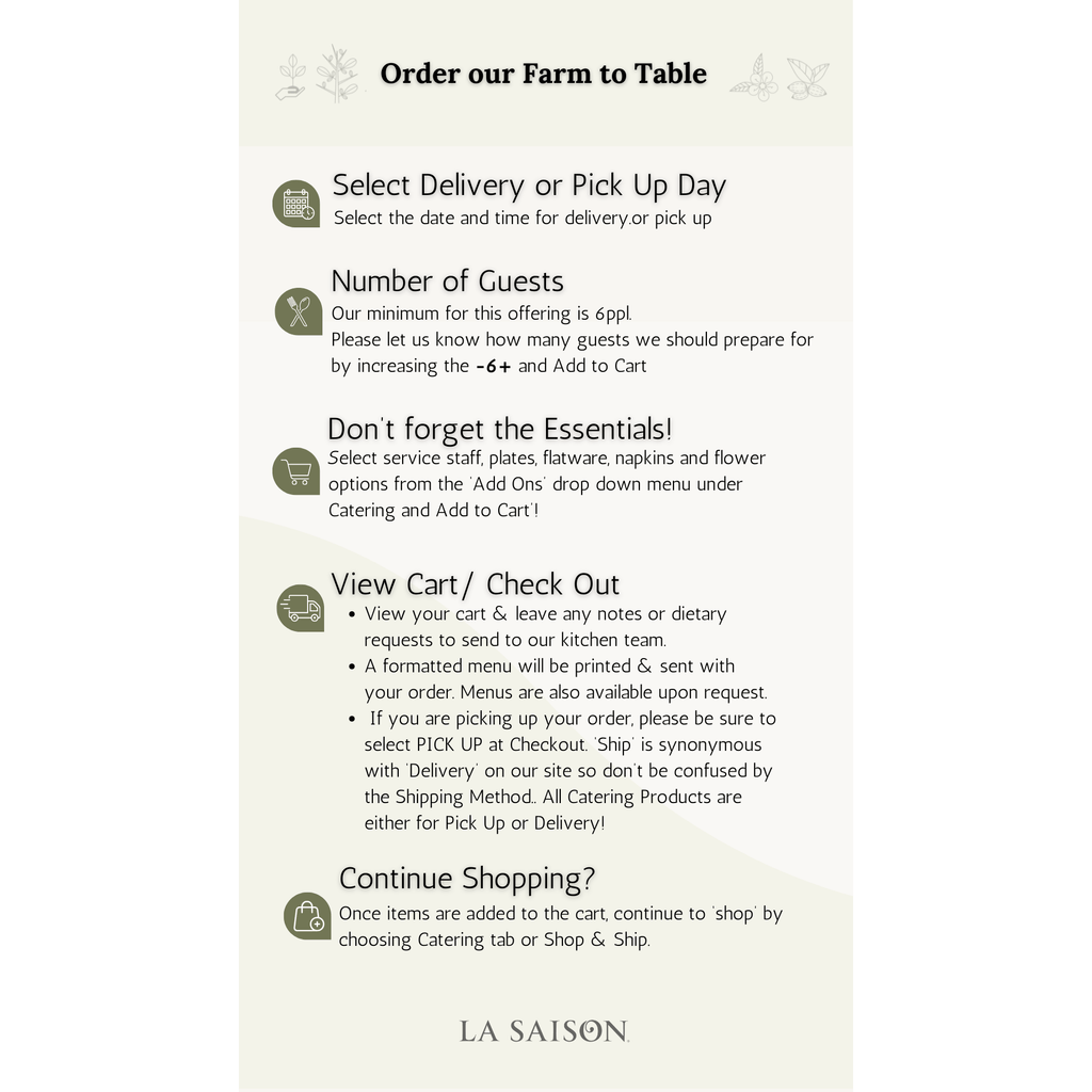 All orders will be delivered with a printed menu. If you have special food requests, add the product to your cart then select ‘view cart’ to leave a message for our team in the note section. The menu below is featured as our current sample Summer menu.